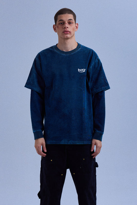 Gray Blue Washed Split Sleeve Classic Logo Crewneck Long Sleeve T-Shirt