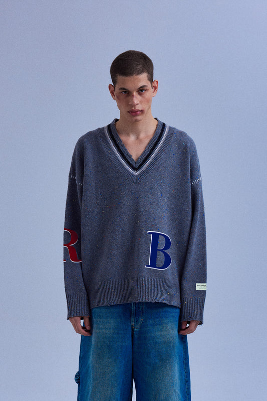 Gray with Large Letter Badge Embroidery V-Neck Oversized Sweater