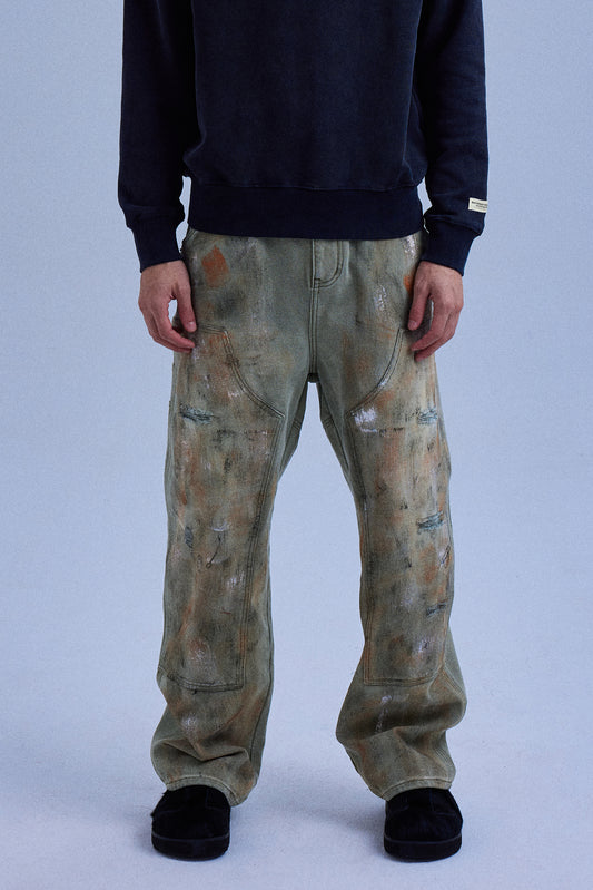 Straight-Leg Workwear Style Oversized Casual Jeans with Paint Splatter Effect and Logo