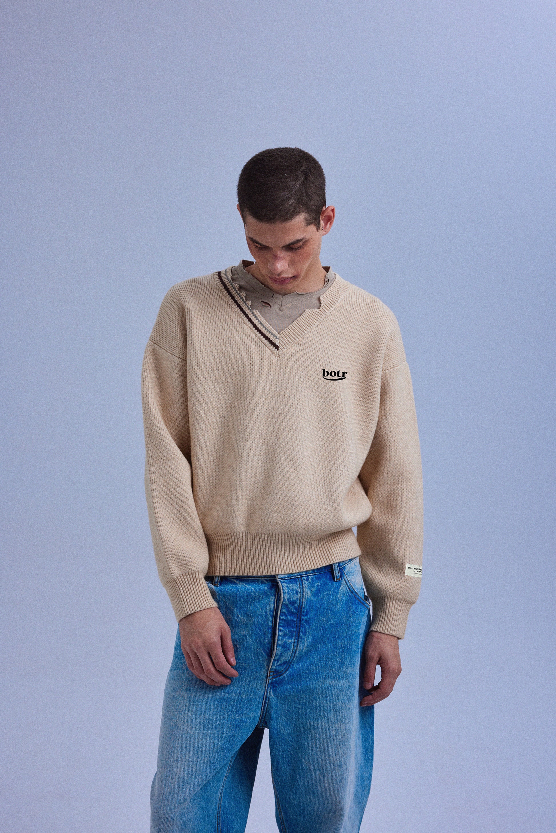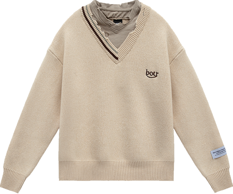 Fake Two-Piece Ripped V-Neck Sweater with Classic Logo Embroidery