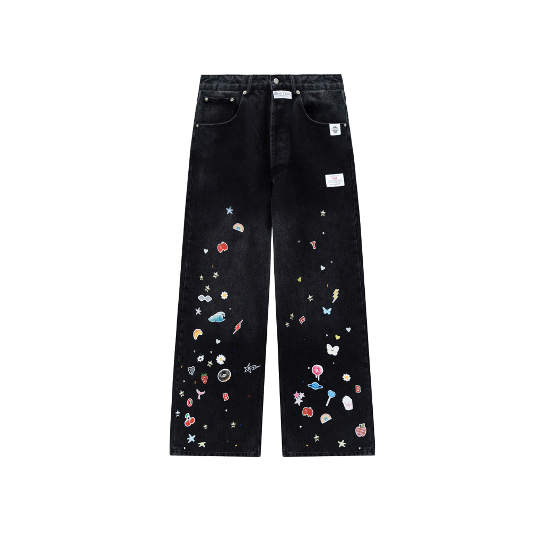 This straight-leg workwear jeans feature sticker prints and rhinestone decorations as highlights. The loose fit not only ensures comfort but also exudes a casual and stylish vibe.